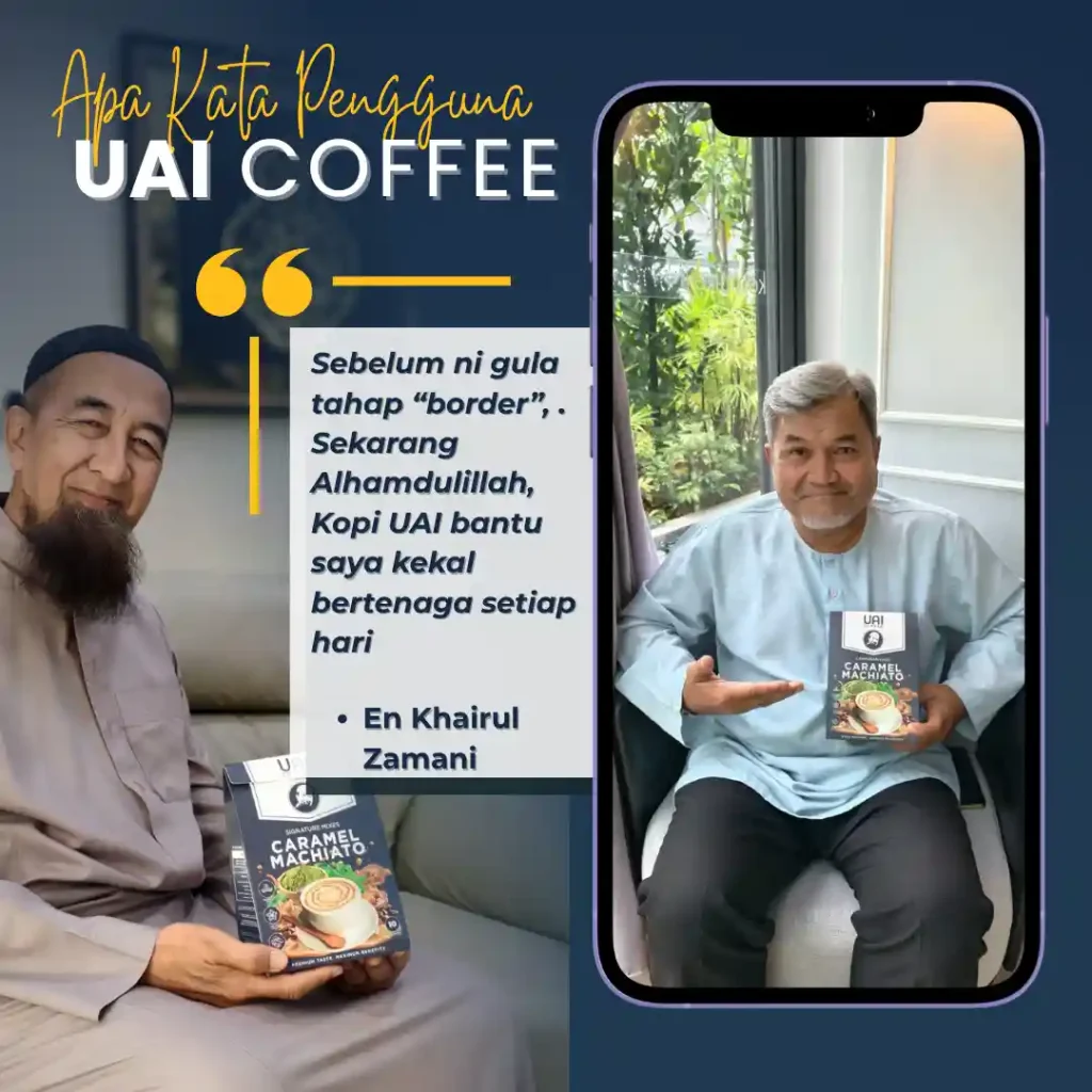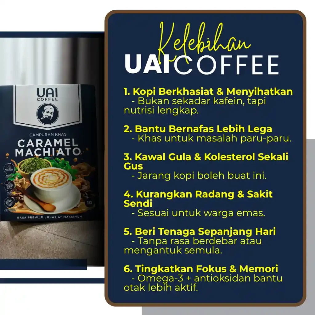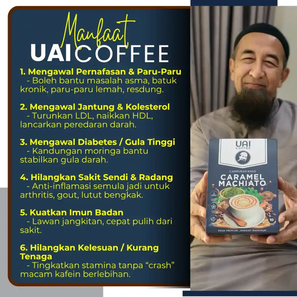 UAI Coffee dibuat daripada bahan aktif seperti Moringa, Sacha Inchi, dan White Tiger Mushroom, yang bantu kawal tenaga, gula, dan saraf secara semula jadi.