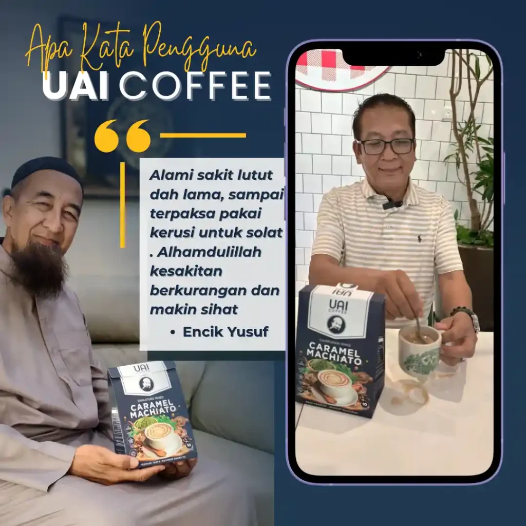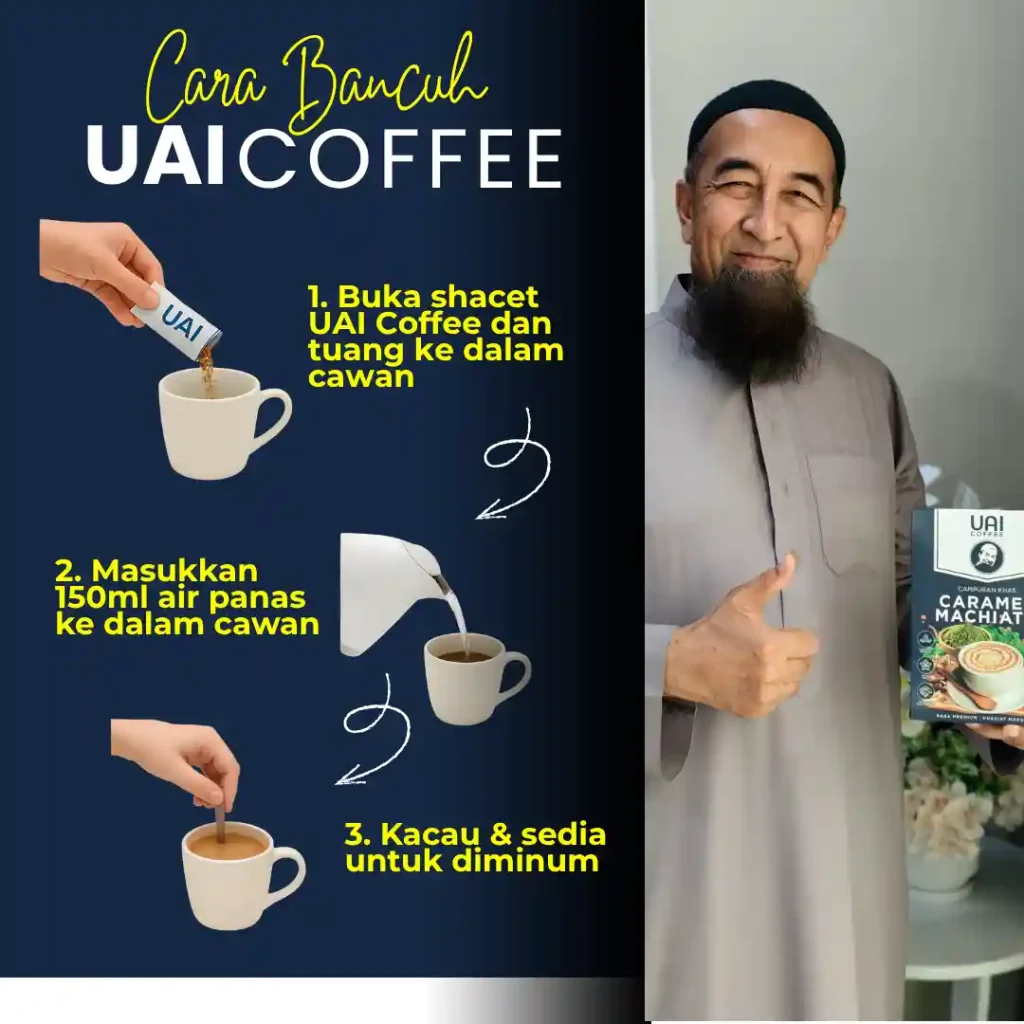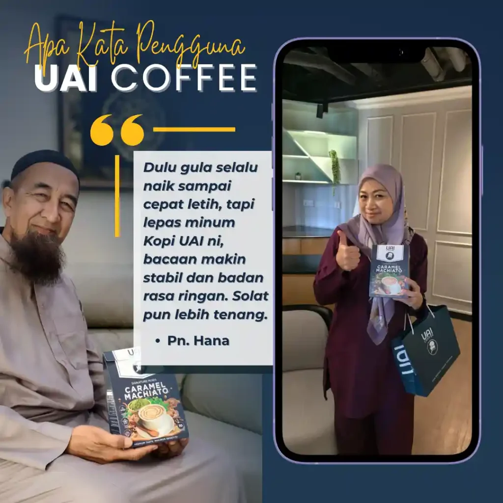 UAI Coffee dibuat daripada bahan aktif seperti Moringa, Sacha Inchi, dan White Tiger Mushroom, yang bantu kawal tenaga, gula, dan saraf secara semula jadi.